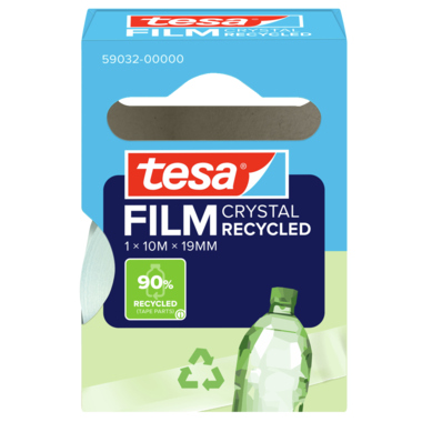 tesafilm® CRYSTAL RECYCLED hochtransparentes Klebeband - Folienträger 90% recycelter Kunststoff aus Verbraucherabfällen.